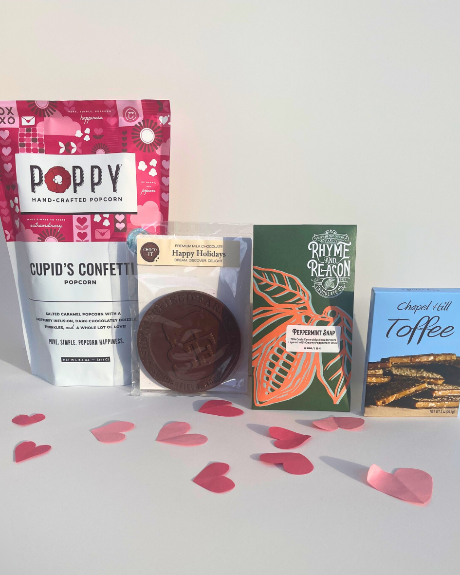 Celebrate love with our Sweet On You Gift Box, featuring irresistible local treats like Poppy Cupid's Confetti Popcorn, Rhyme and Reason Peppermint Snap Chocolate, Chapel Hill Toffee, and Summerfield Farms Milk Chocolate. Sweet On You is a perfectly crafted expression of affection for your chocolate lover. Elevate your romantic celebration with each delightful local bite.