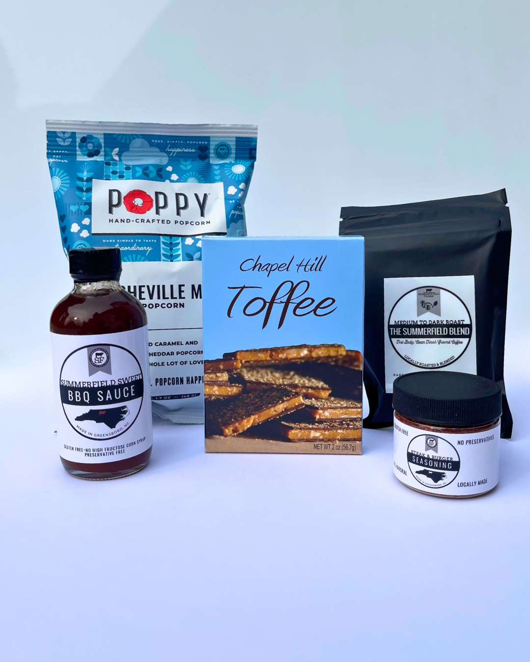 Gift the Taste of NC Immerse yourself in the vibrant medley of Asheville Mix Poppy, a snack that's as lively and diverse as the eclectic city itself. For a taste of elegance, savor the buttery richness of Chapel Hill Toffee, where tradition meets sophistication.Take your grilling skills to the next level with our Steak and Burger Seasoning or our BBQ Sauce ensuring each bite is delicious. Elevate your gifting experience with the flavors that define North Carolina – a basket brimming with Southern warmth and delectable memories!