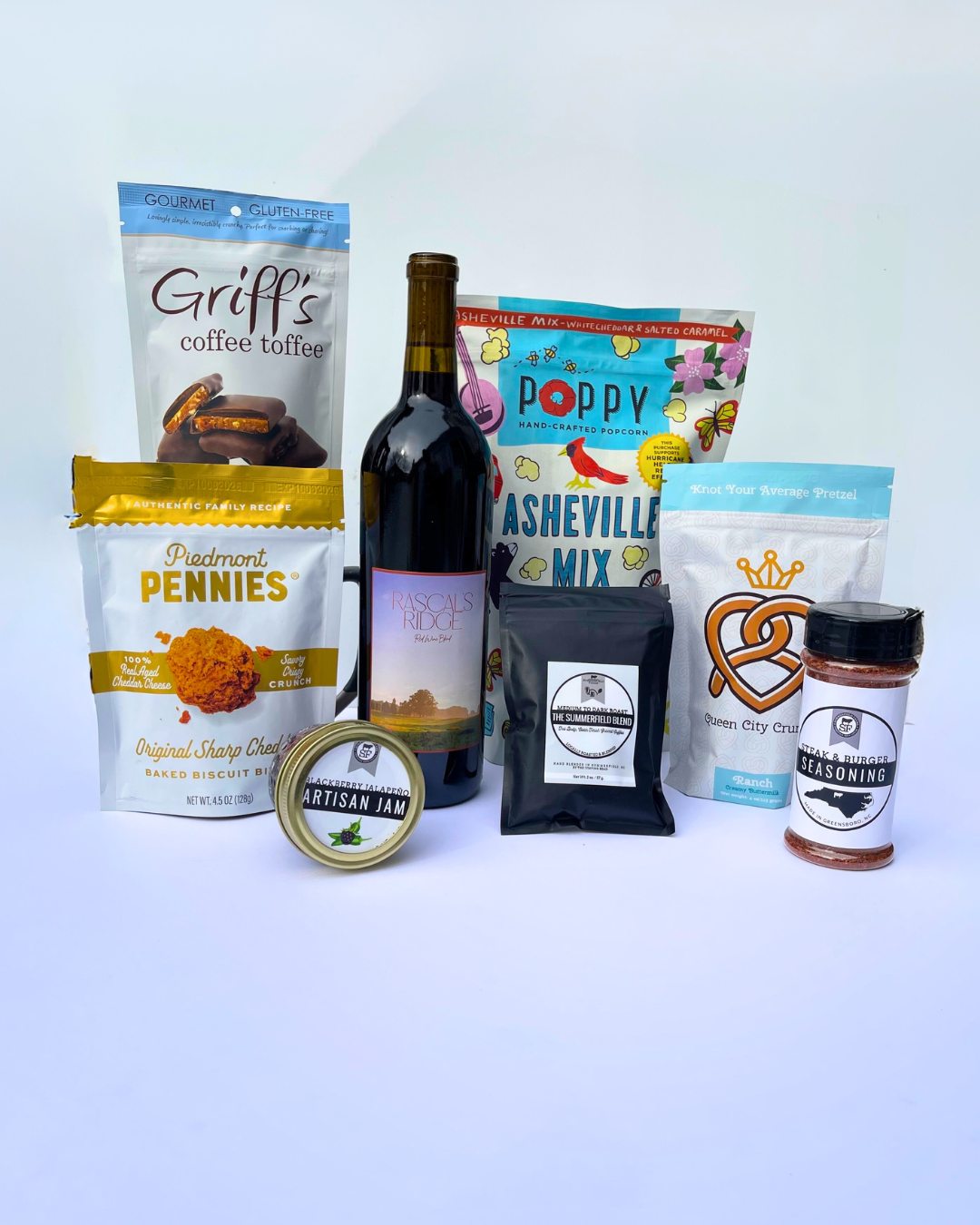 Experience the warmth of Southern hospitality with a bottle of Summerfield Farms Wine that beautifully complements the bold flavors of the region. Take your grilling skills to the next level with our Steak and Burger Seasoning, ensuring each bite is delicious. Enjoy the crunchy texture of Asheville Mix Poppy and the sweet indulgence of Chapel Hill Toffee, which represent the diverse tastes of the area. Satisfy your snack cravings with the addictive 4 oz OG Pretzels and the fruity delight of 4 oz Jam. Start your day with the rich and flavorful notes of our 2 oz Summerfield Blend Coffee, a tribute to the sun-kissed mornings of Carolina. Conclude your culinary journey with the golden medley of Piedmont Pennies, a tribute to Southern heritage. Gift the Taste of NC as an invitation to savor and celebrate the flavors that define North Carolina.